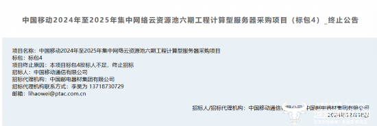 日前,中国移动集团某服务器采购项目标包4宣布终止,这也意味着原先的中标人中标无效。
