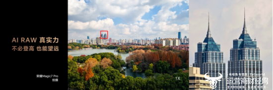 在此基础上,荣耀大王影像升级还带来全新AI超级长焦功能,优化了30x-100x超长望远焦段的拍照清晰度。整个拍照过程会基于部署在云端的124亿参数大模型,通过训练AI学习建筑、自然风光、植物等场景类别的主体拍摄物理特征,让镜头及传感器采集的光学信息进行归纳总结,此时结合不同光照,手机就会输出接近真实效果的纹理、颜色等细节,为了进一步提升用户的长焦使用体验,在联网情况下,用户还可以使用AI超级长焦即拍即得,无需二次进入图库进行云端增强。得益于大模型基座带来的强大算力支撑,荣耀Magic7系列搭载的云端长焦增强大模型,平均每张图片的细节生成计算量达到1.27万亿次,让输出的照片更加细腻锐利,手机望远镜头之所及,细节皆清晰可辨。