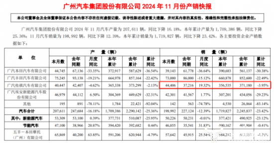 广汽集团在公告中称,集团汽车销量从7月起保持环比增长,同比降幅逐步收窄,全年预计实现汽车产量为191.2万辆,同比下降24.4%;全年销量预计为200.3万辆,同比下降20.1%。