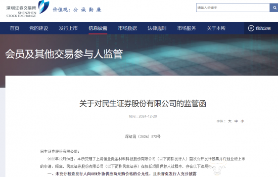 12月20日,深交所发布对民生证券的警示函显示,民生证券在担任上海恒业微晶材料科技股份有限公司(以下简称恒业微晶)首次公开发行股票并在创业板上市项目保荐人过程中,未对恒业微晶相关信息充分核查,未勤勉尽责。同时,该项目的两位保荐代表人赵一明、冯韬也被深交所通报批评。