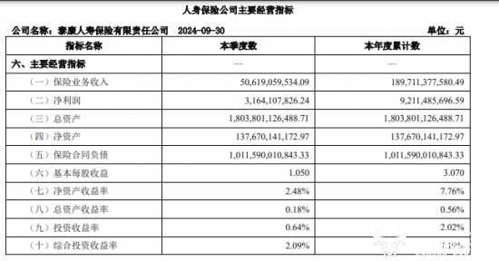 除此之外,据泰康人寿2024年第三季度偿付能力报告显示,在前三季度公司累计保险业务收入为1897.11亿元,净利润达到了92.11亿元。