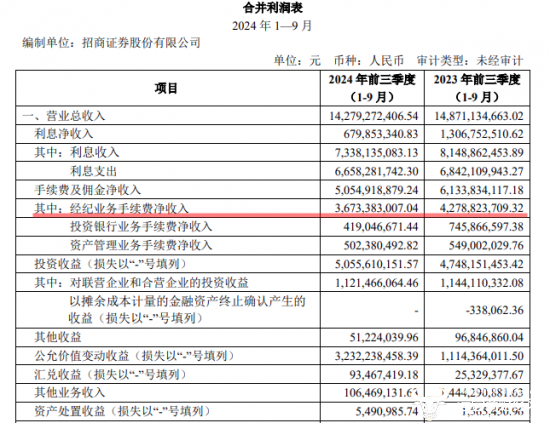 值得一提的是,招商证券经纪业务除了存在合规问题外,还面临着经纪业务收益下滑的问题。据招商证券2024年第三季度报告显示,在亲三季度公司营业总收入为142.79亿元,其中经纪业务手续费净收入为36.73亿元,不如上年同期的42.79亿元。