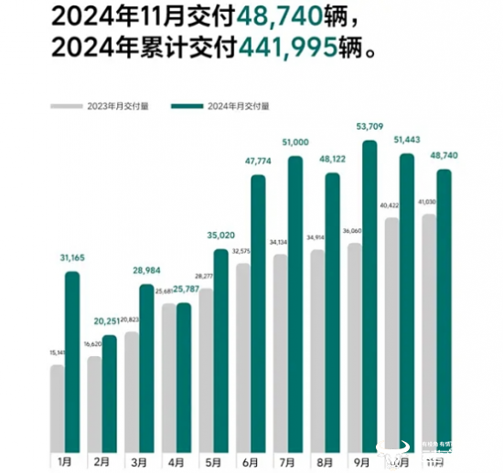 公开数据显示,2024年10月,理想汽车的销量为51443辆,同比增长27.3%,环比下滑4.22%;2024年11月,理想汽车的销量为48740辆,同比增长18.8%,环比下滑5.25%。不仅连续两个月销量同比下滑,还从月销5万辆的级别下降到了4万辆级。