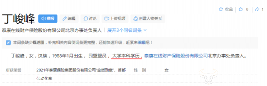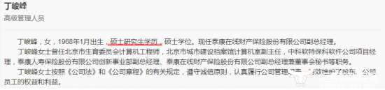 据泰康在线官网显示,其学历为硕士研究生。但百度百科上显示,丁峻峰的学历为大学本科。但不管怎样,丁峻峰本科毕业于国内最顶尖高校中国人民大学就已经足够了,是否获得比中国人民大学名气更低的高校的硕士学位,其实毫不重要。至于百度百科对其的学历描述,可能是滞后了,显然,泰康在线官网的描述更权威。