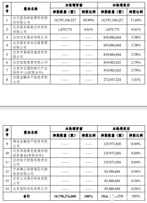 值得一提的是,就在前几天,12月13日,北京汽车股份有限公司以非公开协议方式向北汽新能源增资20亿元,因此北汽新能源此次合计获得增资101.5亿元。本轮增资完成后,北汽蓝谷新能源科技股份有限公司的持股比例从99.99%降至71.69%,但依旧是北汽新能源的控股股东。