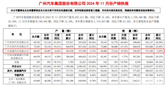 产销快报数据显示,2024年11月广汽传祺的销量为44406辆,同比增长19.32%,是广汽集团旗下品牌中涨幅最大的一家。不过前11个月广汽传祺累计销售汽车356,535辆,同比下滑3.95%。不知李永峰是否会有压力?