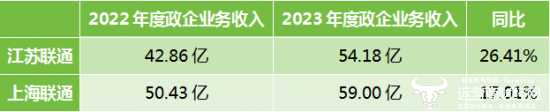 根据上述数据显示,在2022年度和2023年度的政企业务收入上,上海联通一直是超过江苏联通的,不过两家的差距也在逐步缩小,江苏联通的政企业务收入增长速度快于上海联通。