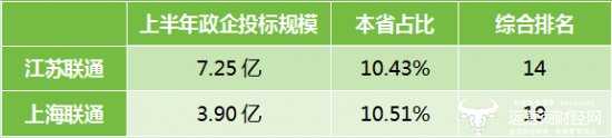数据显示,在投标规模上,江苏联通今年上半年的政企投标规模为7.24亿元,而上海联通的规模则为3.9亿元,两家差距还不小。