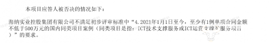 此外,该项目还出现了应答人被否决的情况。海纳实业控股集团有限公司因不满足“2021年1月1日至今,至少有1例单项合同金额不低于500万元的国内同类项目案例”要求,连初步评审都没有通过。