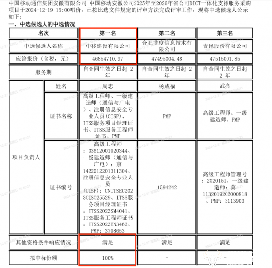 项目不划分标包,也不接受代理商和联合体参加,比选公告中并没有公布预算。半个月后安徽移动就公布了中标候选人,动作很快。