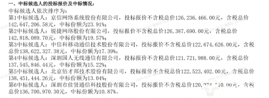 标包1中标候选人为:中信科移动、京信、锐捷、中电科普天、深圳国人、江苏亨鑫、三维通信和广州沐迪。八家厂商报价十分接近,分别约为(含税)3.06亿、3.06亿、3.05亿、2.96亿、2.96亿、3亿、3.07亿、2.9亿。