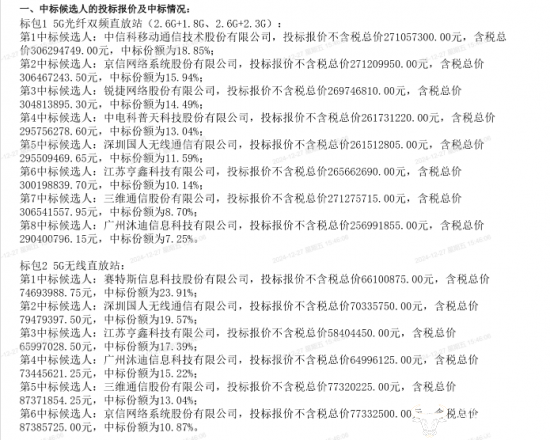 12月20日,中国移动又公示“5G大功率(2.6G单频)直放站设备集中采购项目”中标候选人名单。经评审,京信、锐捷、中信科、深圳国人、北京佰才邦、深圳市佳贤通信六家厂商成功中标,报价也十分接近,分别约为(含税):1.43亿、1.43亿、1.39亿、1.38亿、1.38亿、1.37亿。