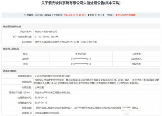 值得一提的是,今年8月,紫光软件参加频谱管控设备(项目编码:2022-JJ08-W1003)项目采购活动中因“无正当理由未按照约定时限履行合同”的违规行为被某系统禁止其3年内参加该系统内物资工程服务采购活动。