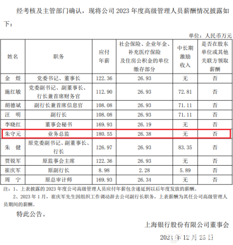 据上海银行披露,朱守元2023年的薪酬是180.55万,位居高管薪酬之首,远高于行长施红敏的112.9万和董事长金煜的122.36万。在没获得中长期激励收入的情况下薪酬最高,看来朱守元在该行很受重视。