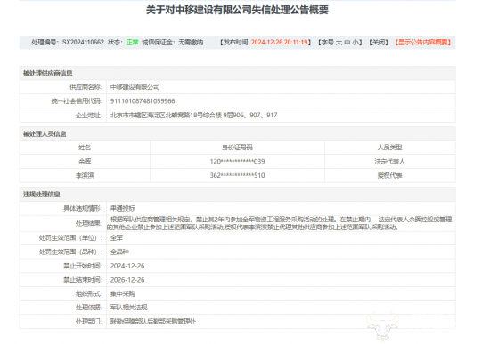 按公告披露,中移建设有限公司在2024年12月26日-2026年12月26日都不能参加该系统物资工程服务采购活动的处理。同时,在未来两年的禁止期内法定代表人余晖控股或管理的其他企业禁止参加上述范围采购活动;授权代表李滨滨禁止代理其他供应商参加上述范围采购活动。