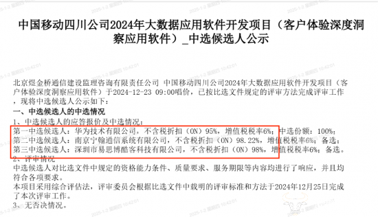 比选公告发布两周后,四川移动就公布了中标候选人名单。第一到第三名分别为华为、南京宁翰通信和易思博酷客,项目不涉及否决情况。作为知名大厂,华为的出现让人意外。