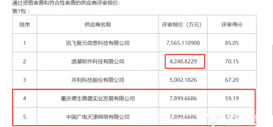 值得注意的是,浪潮软件科技公司也参与投标了,但最终落选,这种情况很常见,并不稀奇。稀奇的是,其投标报价极低,在项目最高限价为8250万元的情况下,浪潮科技给出了4248.8829万元的报价,几乎是五折报价,与最高报价相差约3600万元。虽然浪潮科技报价很低,但很显然,低价策略并未奏效,最终只能空手而归。