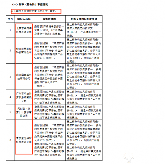 具体来看,没通过初审的6家企业分别为:北京东联国盛、北京航天联诚、北京涵鑫盛、广州申迪、天创者(北京)、重庆紫光华智。