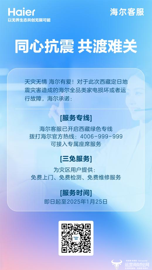 此外,海尔服务已开通三免服务,为海尔系全品类家电免费上门、免费检测、免费维修,并预备好服务兵8人,车辆2辆,待可进入灾区后实施。海尔客服也针对西藏地区开通专线,确保震区用户拨通直进金牌客服坐席。据了解,海尔智家金牌客服团队是一支专业、高效、富有经验的客服队伍,可为地震受灾区域的用户提供更加及时、有效的帮助,从而减轻他们在灾后的困扰和不便。