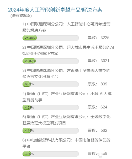 根据1月10日上午10点的投票情况,目前深圳联通打造的“人工智能中心可持续运营服务解决方案”、“超大城市民生诉求服务的AI智能化升级解决方案”以较大票数优势分别位列第一和第二。