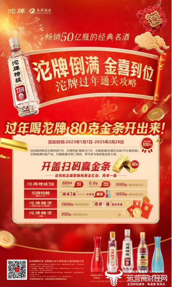 此外,沱牌还于京东、天猫、抖音平台官方旗舰店开启“年货节”,上线热销品专属买赠、店铺满额赠、会员积分加价购等多重专属福利;在线下渠道,沱牌于1月1日在全国范围内推出“沱牌倒满,金喜到位”开盖扫码活动,消费者购买活动商品,即有机会赢取“80g金条”“2888元”“1999元”等现金红包以及“再来一瓶”等多重豪礼,刺激消费者购买热情,“圈粉”更多受众群体。