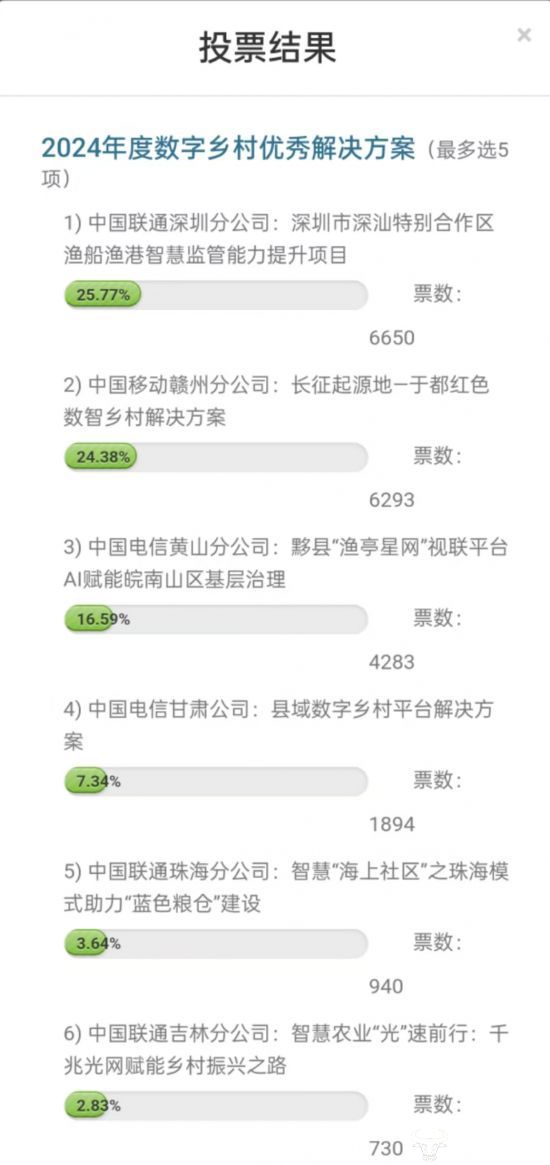 此外,黄山电信的“黟县‘渔亭星网’视联平台AI赋能皖南山区基层治理”方案位列第三。甘肃电信“县域数字乡村平台解决方案”、珠海联通“智慧‘海上社区’之珠海模式助力‘蓝色粮仓’建设”分别位列第四、第五。虽然票数之间有一定的差距,但距评选截止还有一段时间,仍有反超机会。