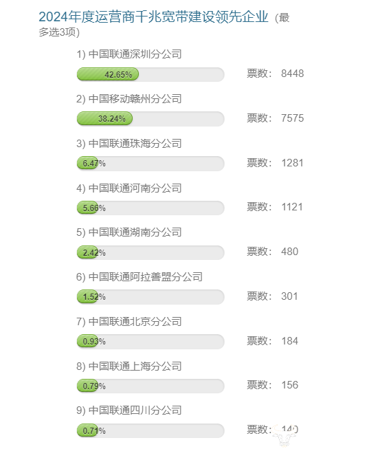 数据显示,目前,深圳联通和赣州移动以较大票数优势分别排名第一和第二,二者票数较为接近,旗鼓相当。