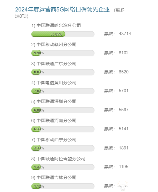 此外,西宁移动、阿拉善盟联通和吉林联通位列第七、第八和第九,且票数差距并不大。