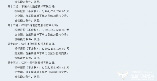 据该公告显示,联通此次光缆集中采购项目共有15家候选人,其中不乏烽火、中天等知名设备商,只不过这两家的排名并不算高,仅排在第十四和第十五名,其投标报价分别为45.924031298亿元和46.2830295844亿元。