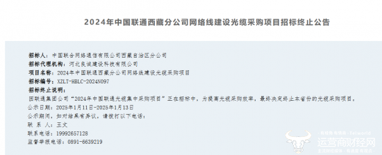 项目公告还显示,该项目的投标截止时间为今年1月9日。然而,就在投标截止的次日,也就是1月10日,其又发布公告称该项目终止,原因系因联通集团公司“2024年中国联通光缆集中采购项目”正在招标中,为提高光缆采购效率,最终决定终止本省份的光缆采购项目。