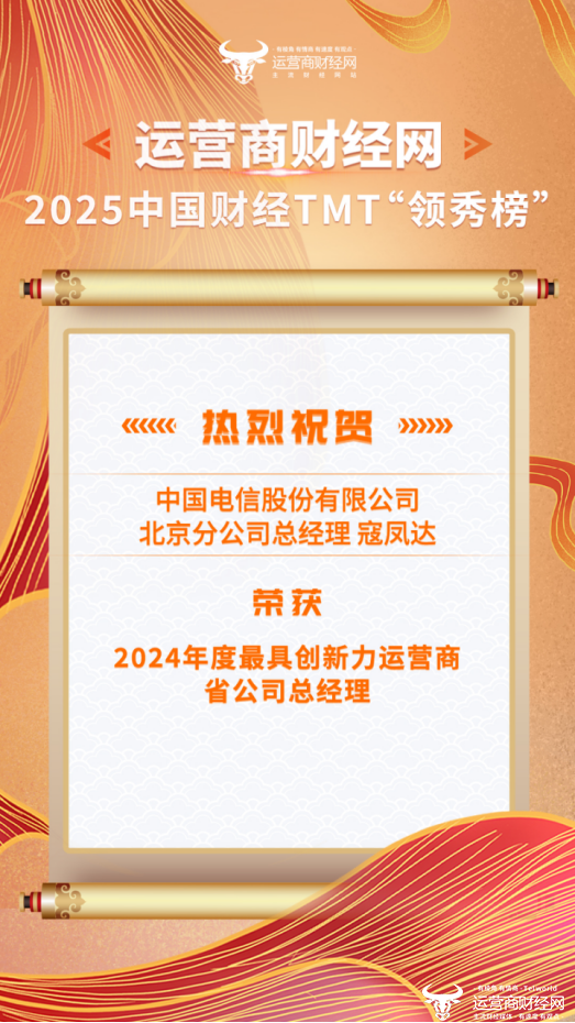 本次评选公平公正公开,竞争异常激烈。盛典现场,运营商财经网正式公布了获奖企业的名单。其中,北京电信总经理寇凤达以其优秀的专业素养赢得了“2024年度最具创新力运营商省公司总经理”奖项,他自2022年7月开始担任北京电信总经理一职,成绩受到广泛认可。