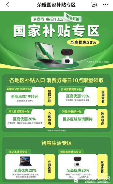 2025年,国家“两新”政策加力扩围,手机、平板、智能手表手环以及电脑等消费品的购新补贴方案正式亮相,为消费者送上一份开年大礼。荣耀作为科技行业的领军品牌,率先加入国家补贴计划,旗下手机、平板、智能手表手环等按产品销售价格的15%给予补贴(单件售价在6000元以内,每件补贴不超过500元),电脑的补贴标准最高则达到了20%(每件补贴不超过2000元),同时荣耀魔法科技年货节也已开启,钜惠福利额外加成,为消费者带来前所未有的优惠风暴!