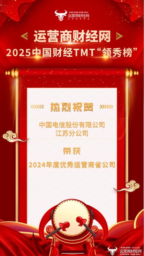 在1月16日由知名财经媒体平台——运营商财经网举办的 2025中国财经TMT“领秀榜”盛典上,江苏电信凭借过去一年的卓越成就,荣获“2024年度优秀运营商省公司”,实至名归!