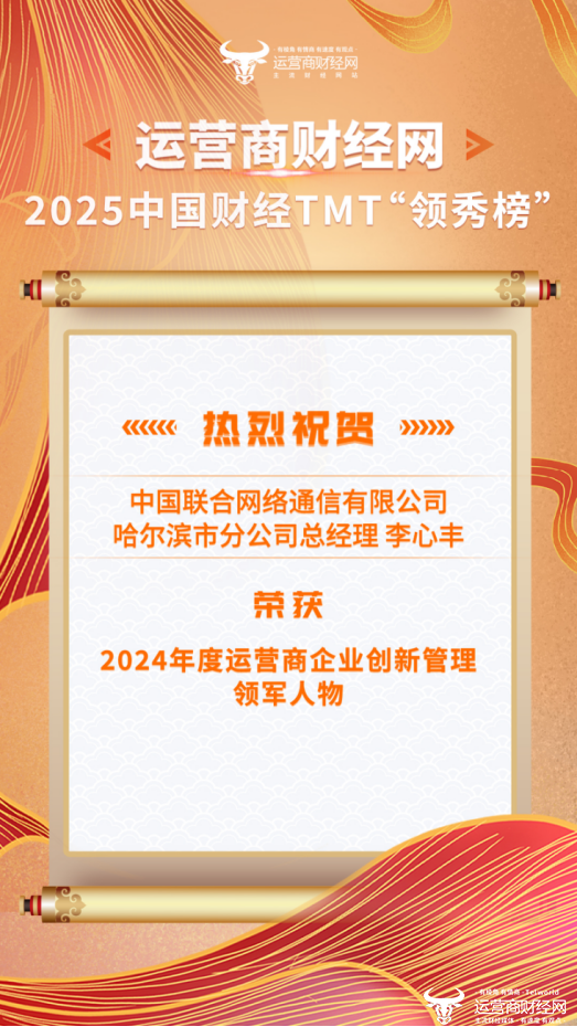 盛典期间,主办方运营商财经网正式宣布:中国联合网络通信有限公司哈尔滨分公司总经理李心丰荣获“2024年度运营商企业创新管理领军人物”奖项,热烈祝贺!