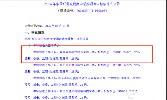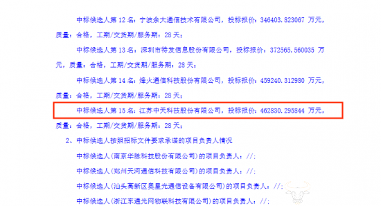 公告显示,项目第一中标候选人是南京华脉科技股份有限公司,该公司投标报价仅29亿元,是15家中标厂商中报价最低的;报价最高的是江苏中天科技股份有限公司,其投标报价约46亿元,排在第十五位。两家供应商投标报价足足差出17亿元。由此来看,投标报价在一定程度上影响了供应商中标排名。