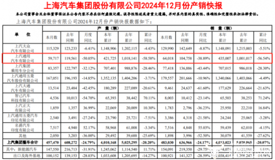 运营商财经网注意到,这一数据与上汽集团产销快报公布的销量数据存在较大出入。产销快报显示,2024年12月份上汽通用的销量为64018辆,同比下降38.89%;全年累计销售汽车435007辆,较去年同期的100.1万辆大幅下降56.54%。