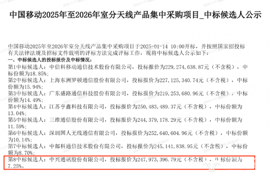 近日,中国移动发布“2025年至2026年室分天线产品集中采购项目”中标候选人名单,知名厂商中兴投标报价约2.48亿元,结果却险些出局,这是什么情况?