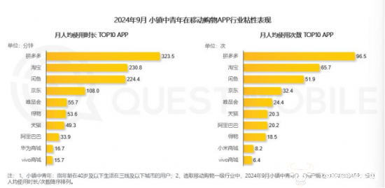 ▲小镇中青年在各移动购物APP的粘性表现,拼多多均位列首位。(来自报告)