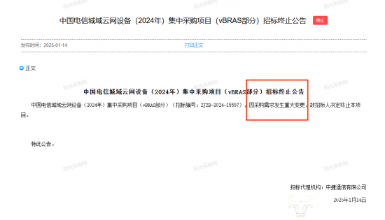 让人意外的是,2025年1月14日,中国电信发布了城域云网设备(2024年)集中采购项目(vBRAS部分)招标终止公告。