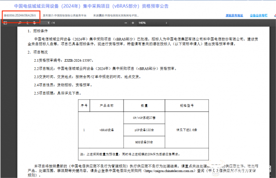 2024年6月26日,中国电信发布“城域云网设备(2024年)集中采购项目”vBRAS部分的资格预审公告。