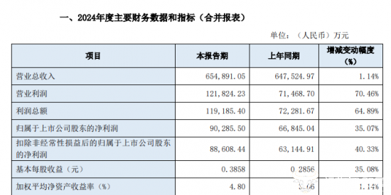 值得一提的是,据东北证券发布的2024年度业绩快报显示,公司在2024年的营业总收入约为65.5亿元,同比增长1.14%。虽然公司营收增长不大,但公司盈利能力却大幅提高。快报显示公司的营业利润约为12.2亿元,同比增长70.46%;归属于上市公司股东的净利润约为9.03亿元,同比增长35.07%。