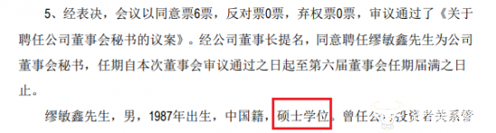 然而,在2022年任命缪敏鑫为公司董秘时的公告中,可以看到,缪敏鑫的学历变为了“硕士学位”,虽然这两次都未提到具体院校及专业,但缪敏鑫都已参加工作很久了,所以推测很有可能是2018年之后读的非全日制硕士。