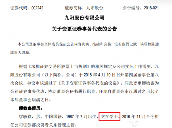 在2018年九阳任命缪敏鑫为公司证券事务代表时的公告中提到他是文学学士学位,众所周知,这是本科学位,而此时缪敏鑫已经31岁,工作多年了。