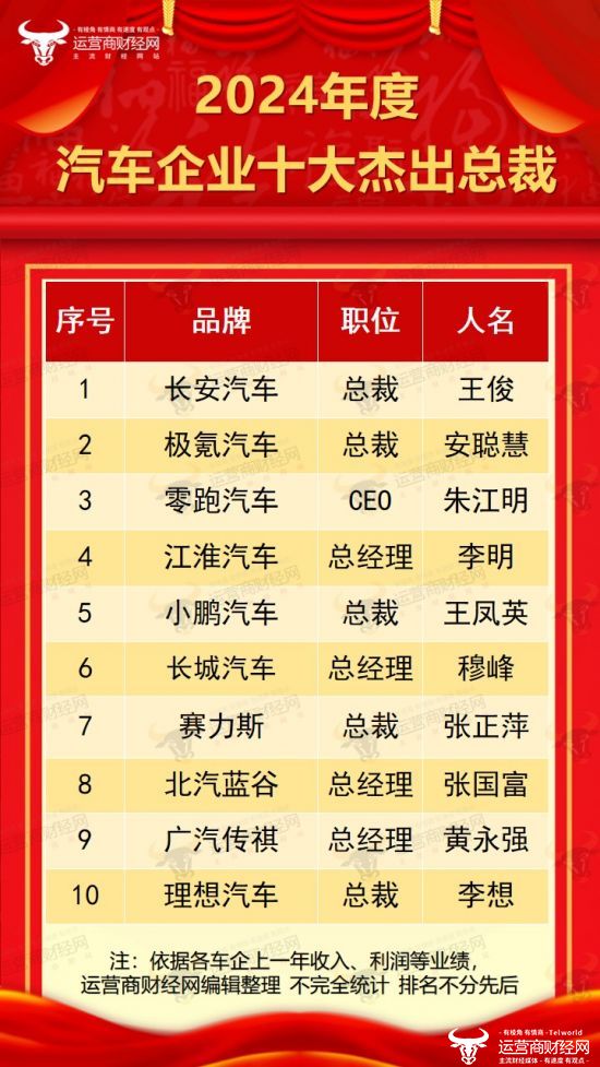 日前,国内主流财经、科技、汽车资讯网站运营商财经网正式推出“2024年度汽车企业十大杰出总裁”榜单。都有哪些车企的总裁榜上有名?接下来运营商财经网将一一揭晓。