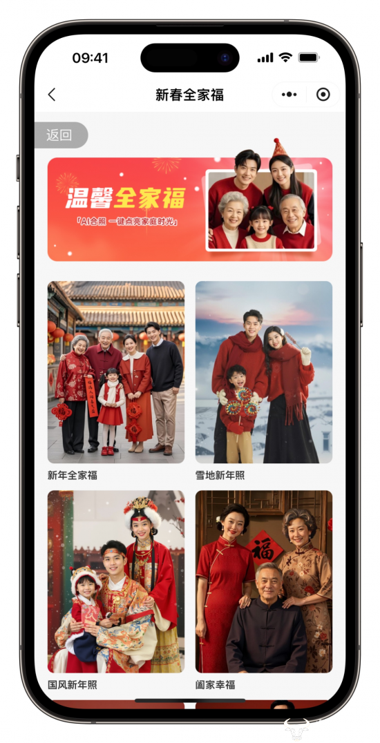 二是AI亲情写真(贺卡),AI全家福实现“云团圆”。亲情写真是爱家秀提供的另一项贴心服务。无论是年轻情侣的甜蜜合照,还是祖孙几代的温馨同框,爱家秀都能一键满足用户的需求。AI全家福功能,利用图像识别与合成技术,能够迅速生成高质量、多种风格的全家福照片。即使家人分散在不同地点,也能通过AI技术实现“云上团聚”。目前,该服务已支持单人写真、写真集、合照/全家福等多种照片类型,并提供了100多个图片模板供用户选择。春节期间,AI亲情写真还可以作为贺卡分享,共同贺岁,趣味十足。