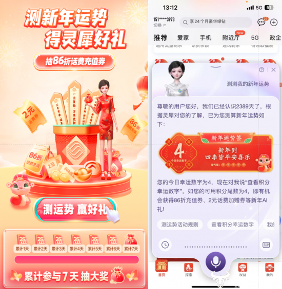 灵犀贺新岁,蛇年福运来。打开中国移动APP,喜庆热烈、红红火火的年味扑面而来,页面底部“C位”的AI智能助理灵犀也换上了春节专属装扮,新春氛围感拉满。