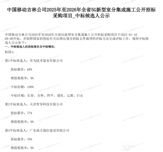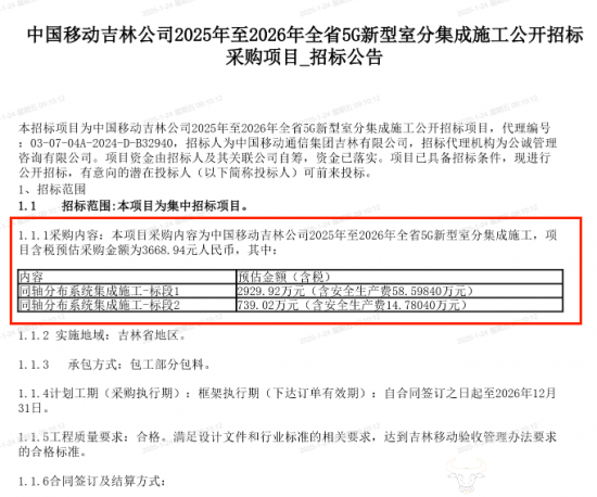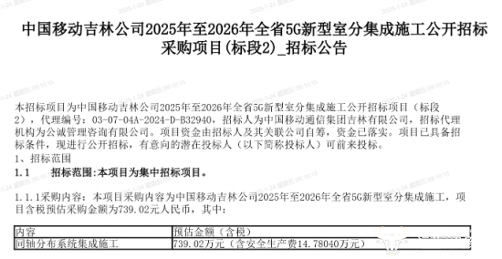 2024年12月24日,吉林移动发布“2025年至2026年全省5G新型室分集成施工公开招标采购项目”招标公告。项目划分为2个标段,标段1预估金额为2929.92万元(含税,含安全生产费58.59840万元),标段2预估金额为739.02万元(含税,含安全生产费14.78040万元),总预估金额达3668.94万元,规模不算小。