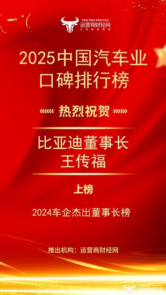 作为汽车行业的敏锐洞察者,运营商财经网隆重推出了“2025中国汽车业口碑排行榜”系列榜单,涵盖了杰出高管、车型人气、传播指数等多个方面。日前,该系列的第二个榜单——“2024车企杰出董事长榜”名单正式出炉,其中,比亚迪董事长王传福榜上有名!