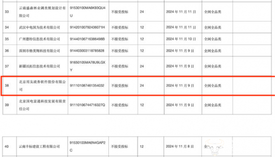 公告显示,自2024 年11月9日起,未来24个月内,将不接受北京用友政务软件股份有限公司投标,处理范围为全网全品类。