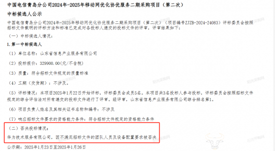 值得一提的是,华为旗下的华为技术服务有限公司也来参与投标了,但因不满足招标文件的团队人员及设备配置要求被否决投标。